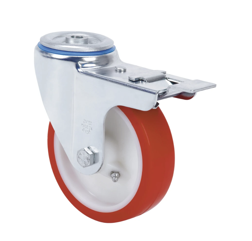 Räder aus weissem Nylonkern und Reifen aus rotem gespritztem Polyurethan mit einer Härte von 90-95º shore A. Geeignet für Ladungen bis zu 400 kg.