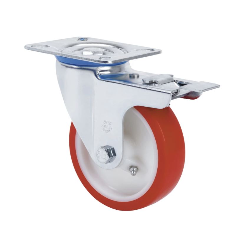 Räder aus weissem Nylonkern und Reifen aus rotem gespritztem Polyurethan mit einer Härte von 90-95º shore A. Geeignet für Ladungen bis zu 400 kg.