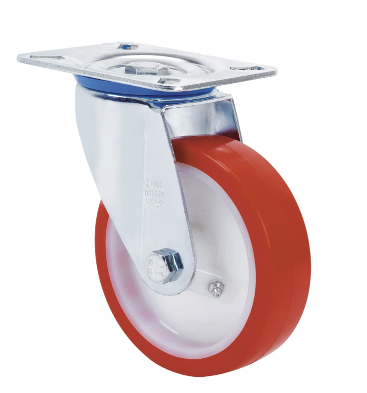 Kolieska s bielym nylonovým jadrom a červeným vstrekovaným polyuretánovým plášťom s tvrdosťou 90–95 Shore A. Určené najmä pre vysoké zaťaženie až do 400 kg.
